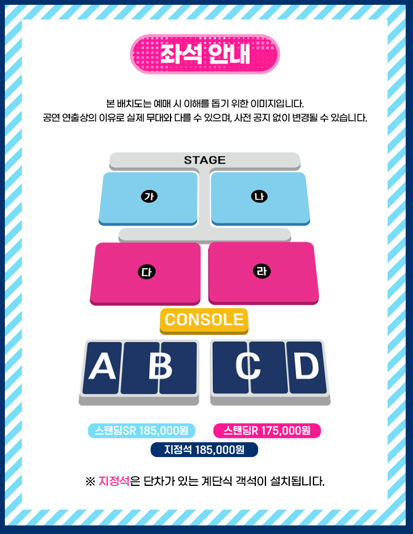 | 지정석 SR / 스탠딩 SR | 185,000원 | 무대와 가장 가까움, 몰세례 최고 |