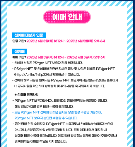 피네이션에서 발행한 싸이 NFT 보유자만 참여 가능하며, 예매는 NOL 티켓에서 진행됩니다. 일반 예매와 가격 차이는 없습니다.